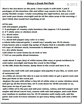 Her Crock Pot Pork recipe has become a favorite. There are a few steps, nothing complicated though, and it all comes together very well.